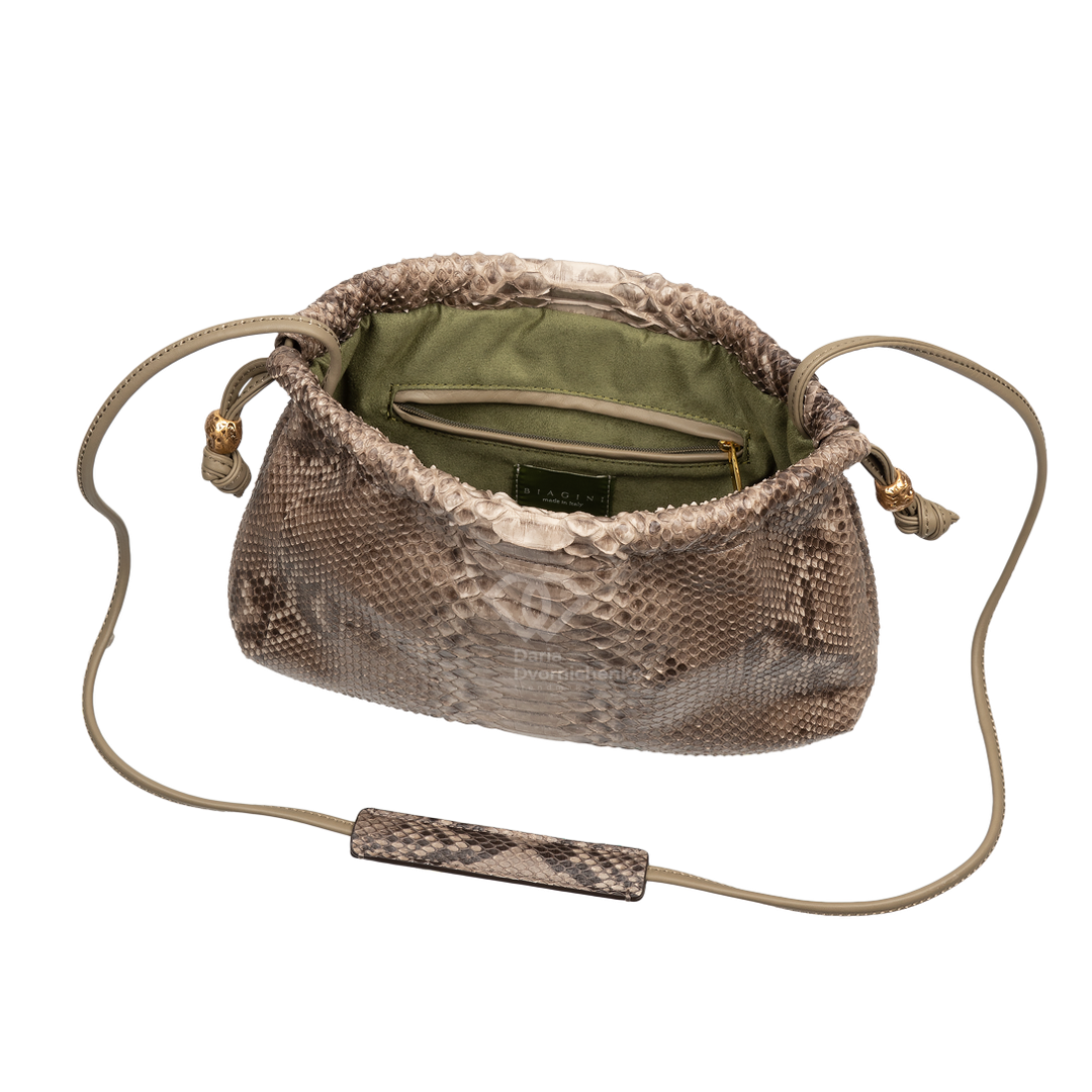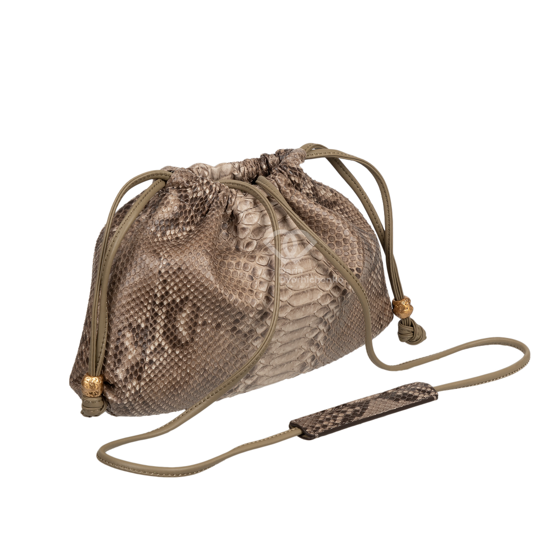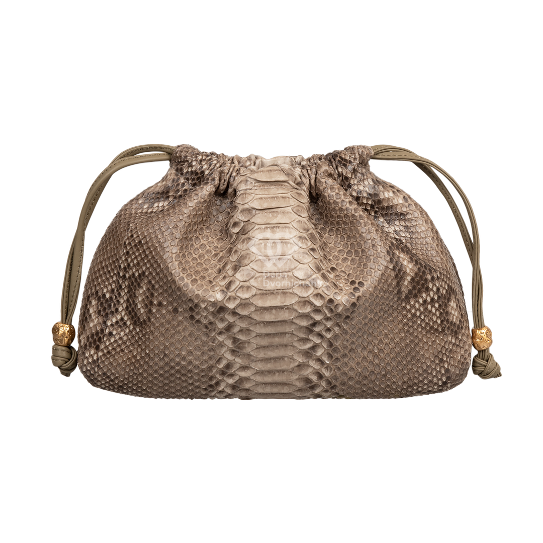 Изысканная женская сумочка - пуш выполненная из 100% натуральной кожи питона. Этот уникальный аксессуар отличается глубокой и благородной текстурой чешуек кожи питона, которые создавали неповторимый и роскошный вид.Модель в форме мешка затягивается на кожаные шнурки с элегантными золотистыми металлическими бусинами , что не только обеспечивает удобное закрытие, но и служит стильным декоративным элементом. Сумка оснащена длинным тонким плечевым ремнем из кожи с мягким наплечником для комфортного ношения.